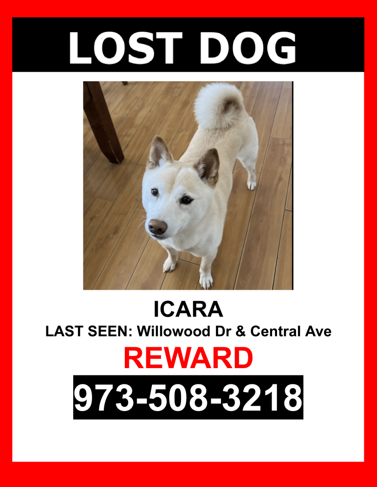 Pet Description:**MISSING SINCE 07/18/25 AT 04:00 PM**ICARA is a FEMALE, WHITE/TAN EARS, SHIBA INU who escaped and was last seen near WILLOWOOD DR/CENTRAL AVE.ICARA is NOT wearing her collar and IS microchipped.If you see ICARA please DO NOT CHASE HER.PLEASE CALL OR TEXT ONLY.973-508-3218$$ Reward $$ |