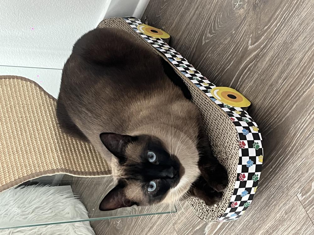 Pet Description:Our female siamese is medium sized and has blue eyes with the right side a bit of white hair growing. She's very friendly. Weights around 13lbs |