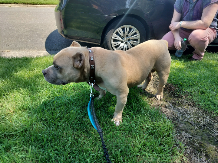 Pet Description:Light tan bully, intact male. Cropped ears, intact tail. No chip or tags. Found wearing a dark brown leather collar with metal bone decals. Very friendly. |