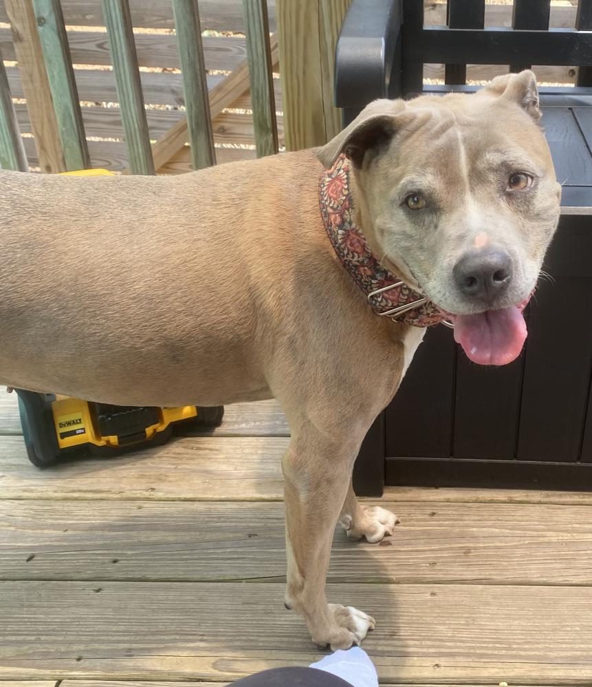Pet Description:Pitbull and American BulldogLight Golden with some Gray hairs FemaleHas a multi color collar |