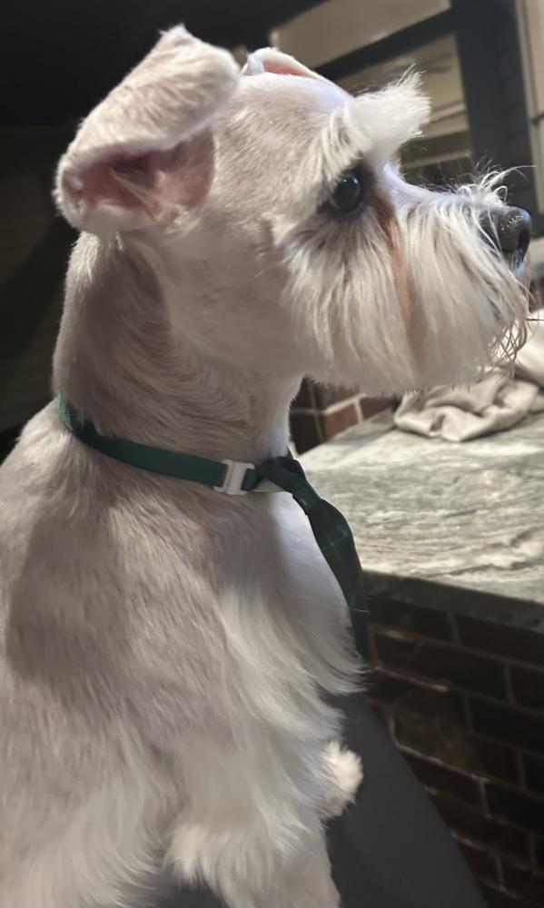 Pet Description:White miniature schnauzer with black spots. Schnauzer cut. |