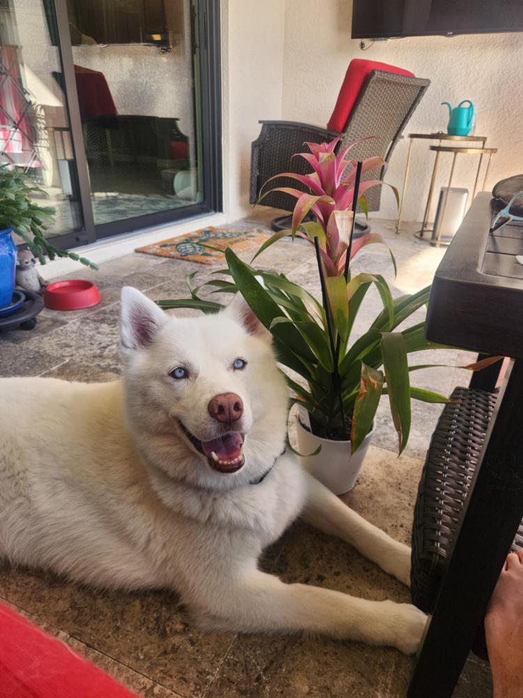 Pet Description:All white female husky with light blue eyes and pink nose. 7 y/o. Very sweet and friendly, will come if called. Wearing teal, coral and grey collar. |