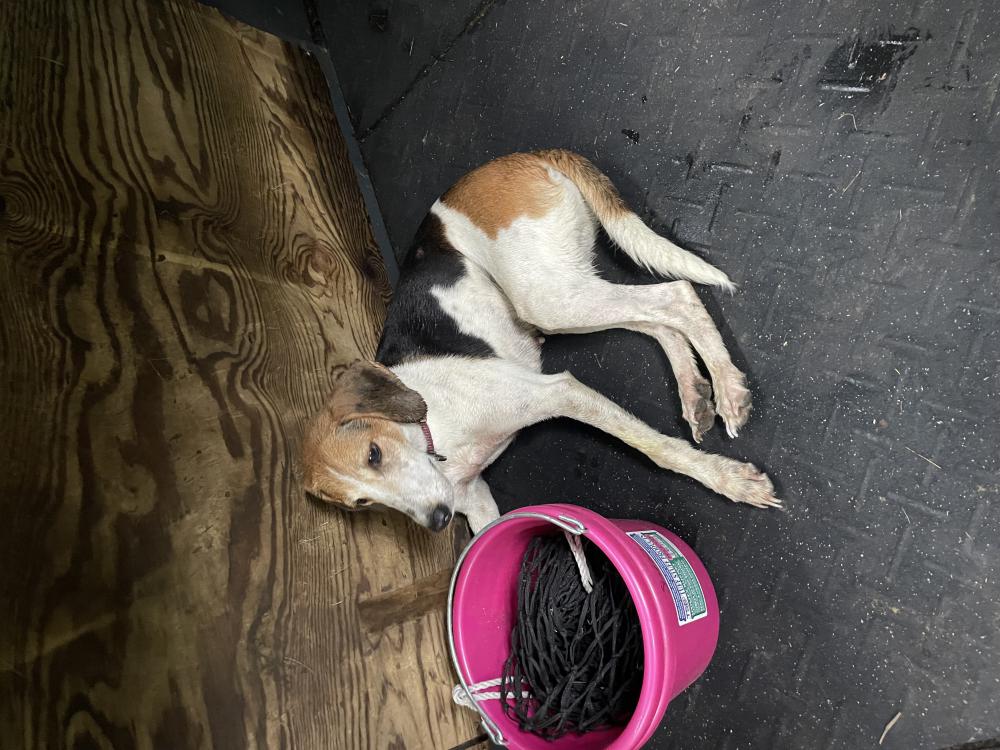 Pet Description:Very friendly female hunting breed dog with purple nylon collar |