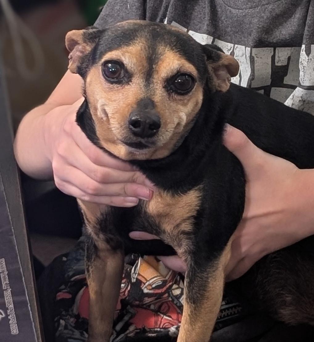 Pet Description:Hita is a miniature pinscher and Chihuahua mix. She bolted out of a hotel room door when it was opened to take out trash. She isn't wearing a collar but is microchipped. |