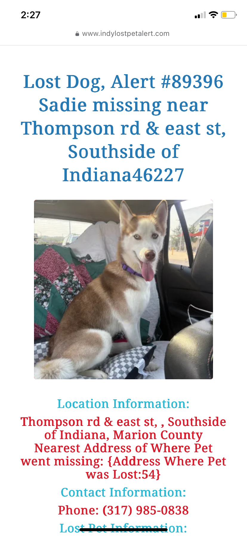 Pet Description:Her name is Sadie she is very friendly shes white and light brown she has a purple collar and her leash is still attached |