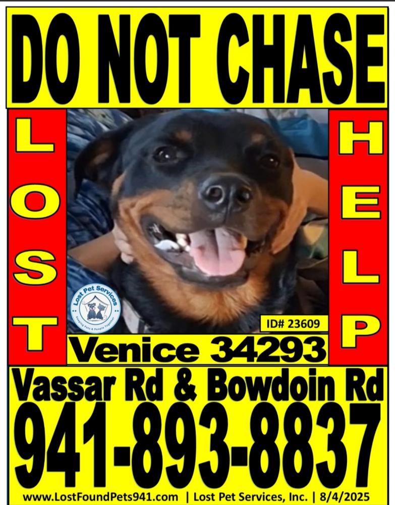 Pet Description:American Rottweiler female missing not wearing her collar but microchiped lost in South Venice Florida 34293 off of college named streets. |