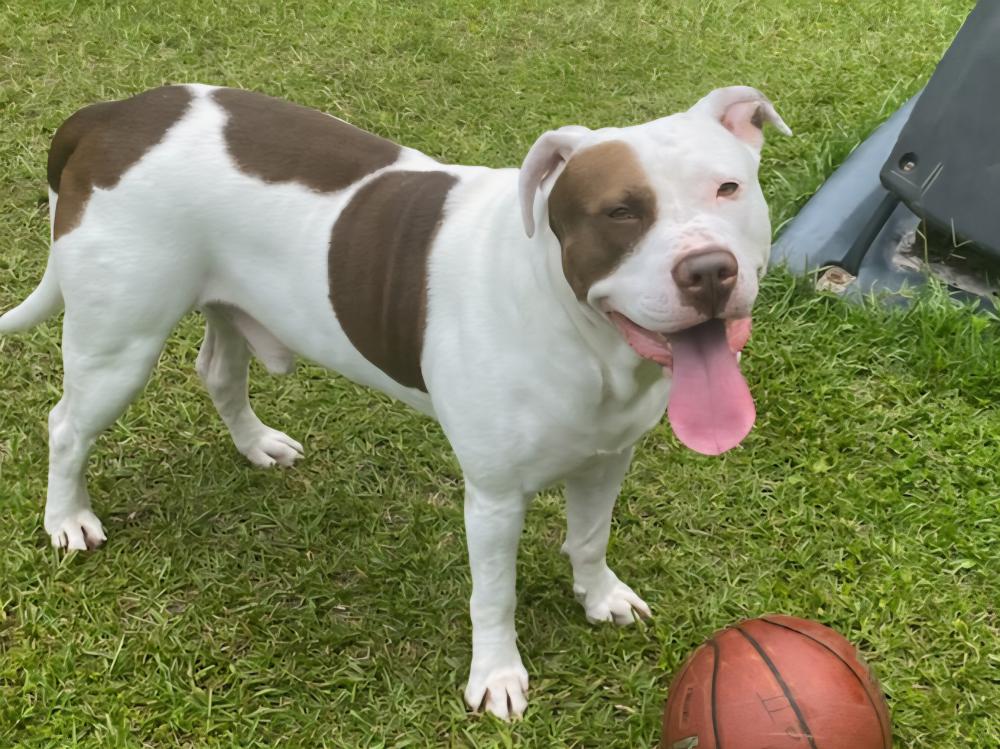 Pet Description:Large white pitbull with chocolate brown spots and one spot covering his eye. He ran without a collar. Will likely be very dirty as he has been missing for 8 days currently and is believed to be traveling through fields and farmland |