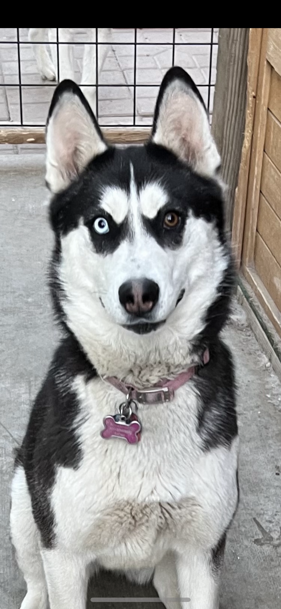 Pet Description:She is 5 years old black and white 1eye brown and 1 eye blue. She have a pink collar |