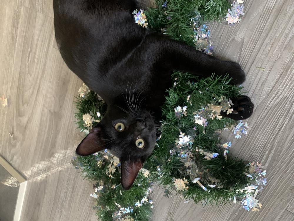 Pet Description:Jinx is a 3 year old all black cat, he was lost with no collar but he is chipped to my name and number. he has small patches of thinning hair in front of his ears |