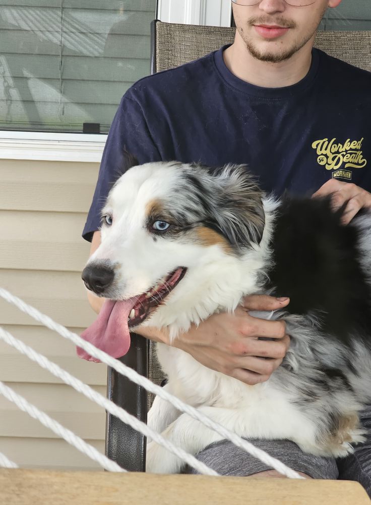 Pet Description:Young male Australian Shepherd, black, white and grey with brown, blue eyes. |