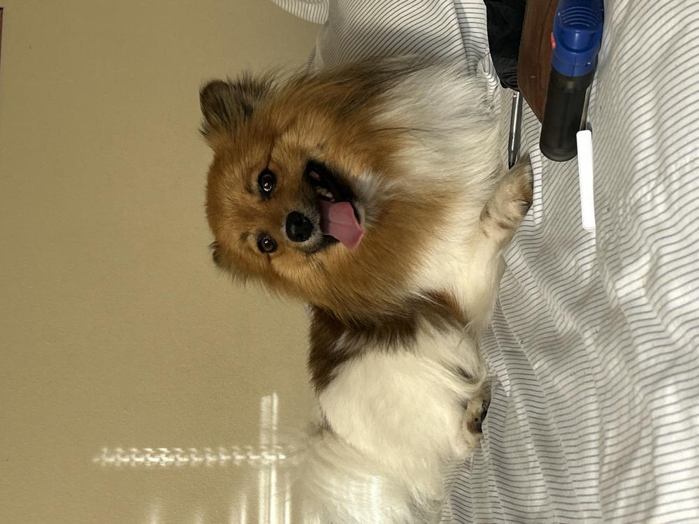 Pet Description:About 20 pounds Brown face Mostly white with brown spot on his back curled tail very energetic his name is 50 blue collar with name tag and red flea collar |