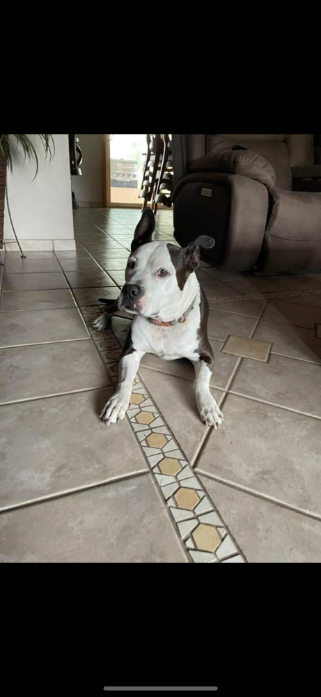 Pet Description:She’s a 14 year-old pitbull slightly deaf and walks with a limp. She is black and white. |