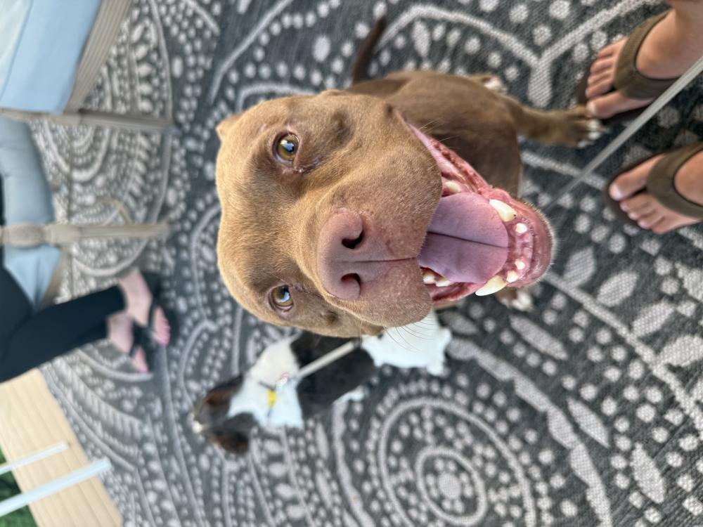 Pet Description:Brown and white pitbull. Super sweet and responds to basic commands. Also does well with other dogs and kids. No collar. |