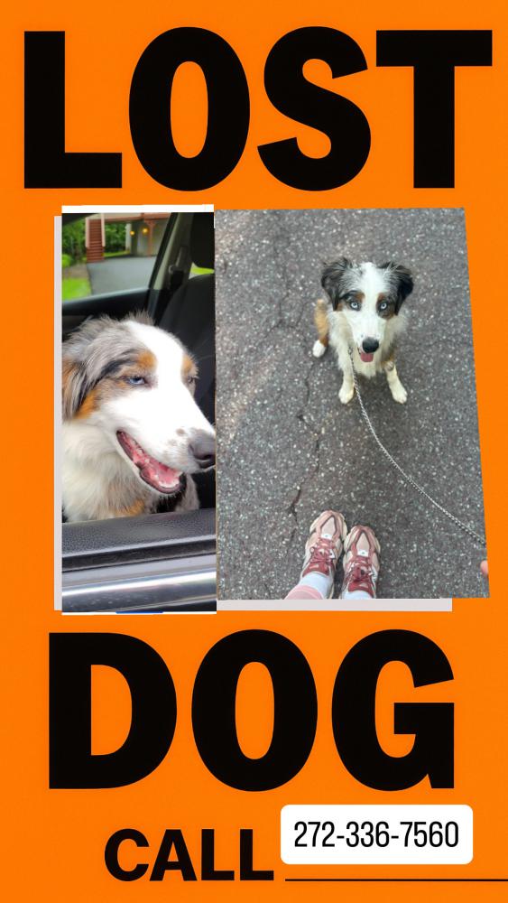 Pet Description:Medium-sized Australian Shepherd with striking icy blue eyes. He has a mostly white face with a black nose and brown patches above his eyes (like eyebrows). His fur is a mix of white, black, gray (merle), and brown, with a fluffy tail. He was last seen wearing a long blue leash that may still be attached. Very friendly but may be scared and run if chased. |