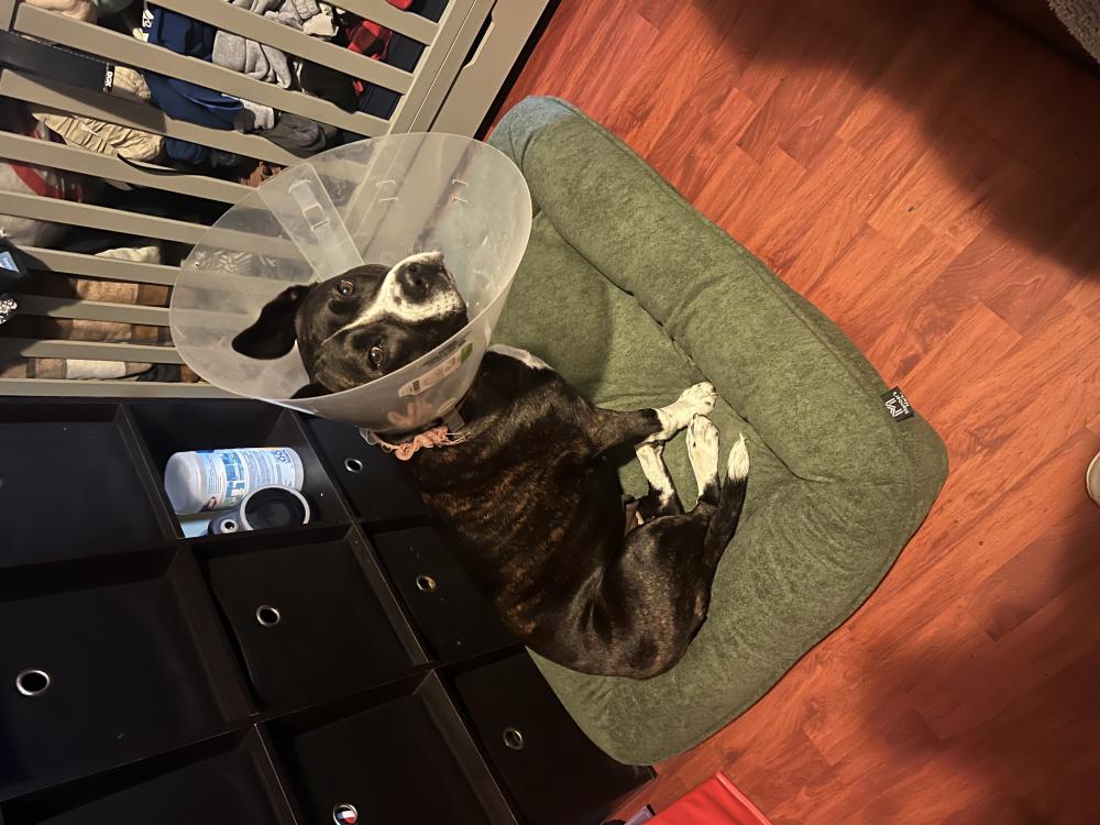 Pet Description:Luna is a pitbull chow chow white and black w brownish spots white tip on her tail and her paws are also white , nails are clear and some black . She just got fixed so you can see were she had her surgery . She no longer has the cone and no tags but microchipped . |