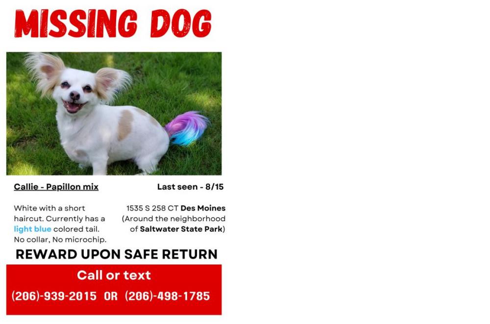 Pet Description:White with tan patches, also currently has blue colored tail. |