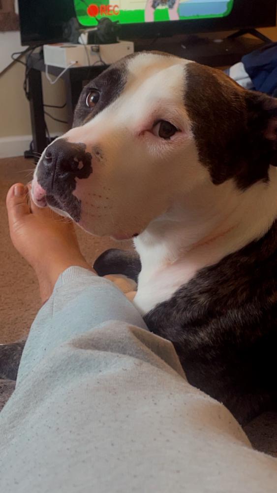 Pet Description:Large American Staffordshire Terrier with primarily brindle coat with a large left side white coat. Special Marking: has two small brindle patches on his eyelids (top and bottom) on white coat side |