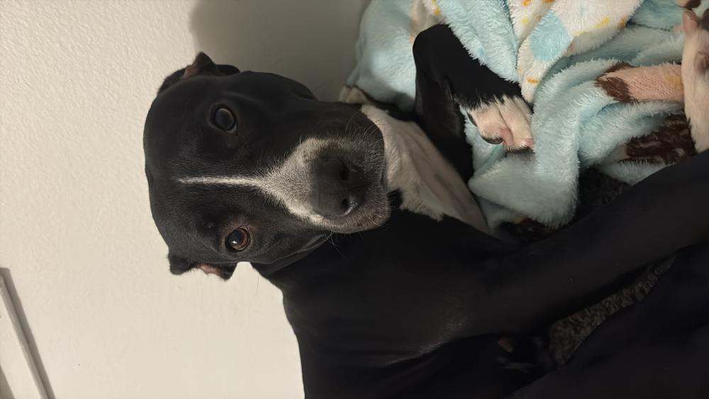 Pet Description:Very nice very sweet dog female is black with white patches is wearing a purple vest harnest |