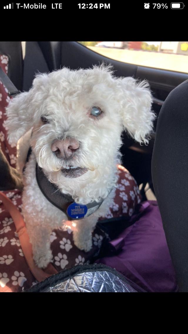 Pet Description:Tye is 15 yo poodle mix white curly hair blind one eye more that the other he is wearing a collar with name /phones numbers and also ring pet tag with QR information. Let me find him I would really appreciate your help |