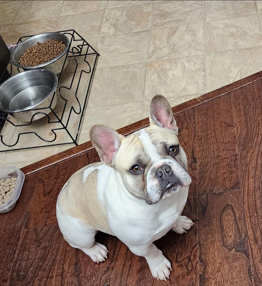 Pet Description:Tan and white French bull dog. Loves to hang outside. No collar no chip. |