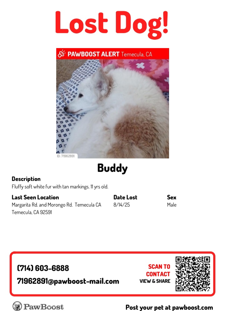 Pet Description:Fluffy white fur with tan markings. Long fluffy white tail. No collar on at the time he went missing Aug. 14th. Cross streets Margarita and Morongo Rd. Temecula CA 92591 Microchiped. Please call 714-603-6888 Note,If you found my Buddy boy and checked the chip, the wrong ph # was on file as 714-521-4923 and is a disconnected #. I have updated it to my current ph # above. |