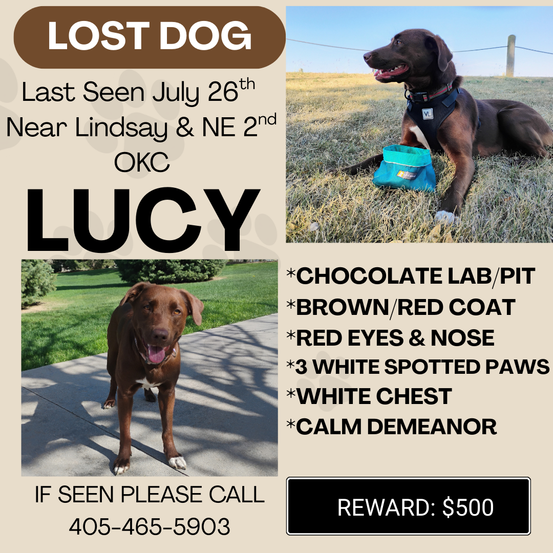 Pet Description:Chocolate Lab/Pit Bull mix, red/brown fur with white chest, white front paws, one white rear paw, grey collar with black plastic buckle, cautious with new people, very sweet and safe, however capable of aggression if she feels threatened or responsible to protectwants to friends with everyone never licks people nice to all other animals loves to fetch comes to whistle and clapping and |