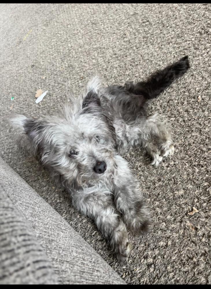 Pet Description:He’s a terrier. Dark grey, light grey, black, white. Body is shaved down but his tail is very fluffy. Black tail. He’s very friendly |