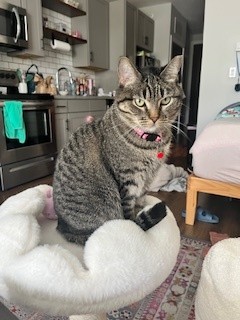 Pet Description:Taylor is a small dark-grey tabby. She has one clipped ear and green eyes. She is very timid and will not let strangers approach her. She is about 7 pounds. |