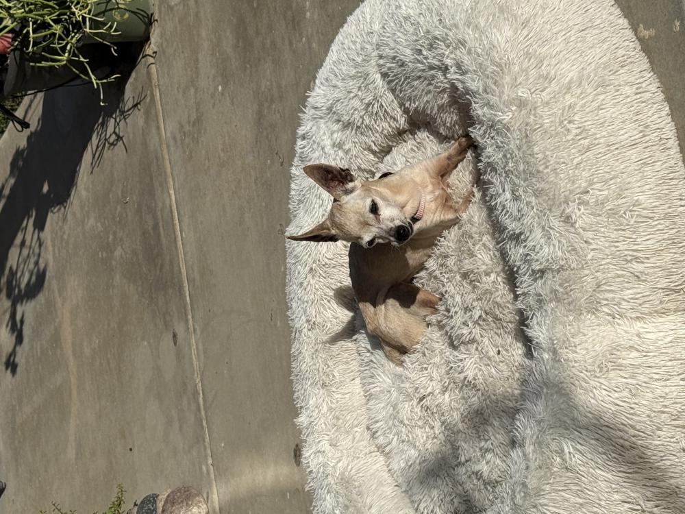 Pet Description:Older, skinny brown, and gray Chihuahua with a mole on her face. |