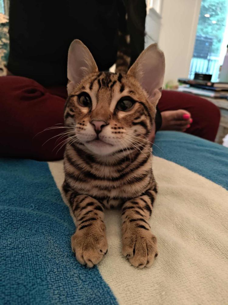 Pet Description:Bengal kitten, 14 weeks old, very skittish, small notch on his right ear. |
