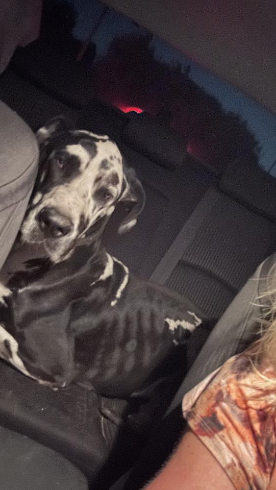 Pet Description:One to three year-old male, intact, Harley Quinn colored(black and white), Great Dane. Skinny. Wearing a old brown and torn collar |