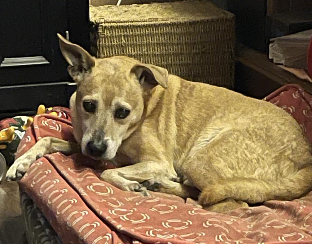 Pet Description:35 pounds, short hair, reddish tan, navy collar |