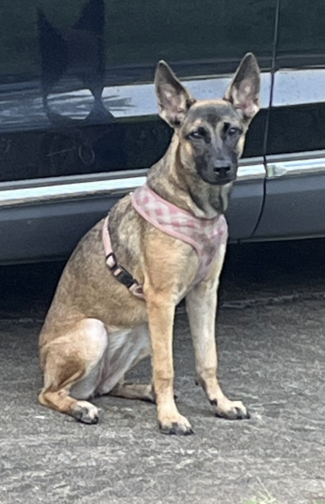 Pet Description:Wearing a pink checkerboard type print harness. A lot of black on face. Markings look like she has copper red eye brows. Long tail. |