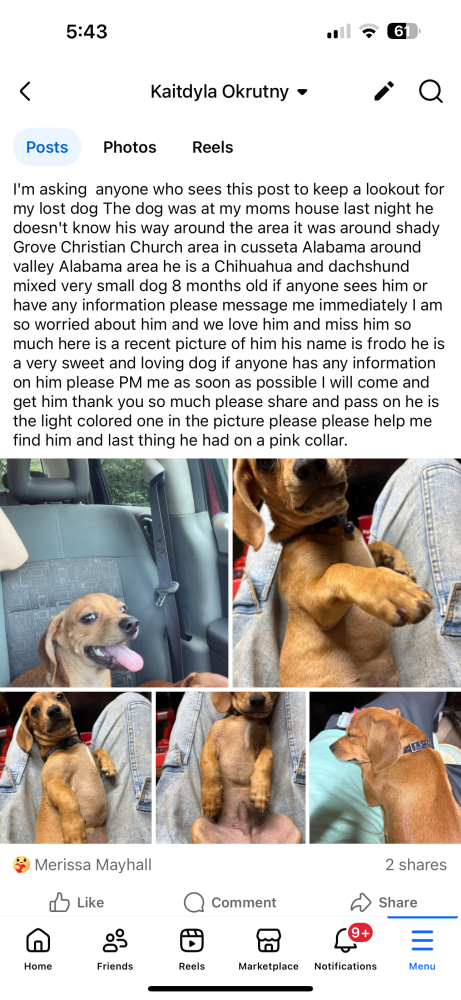 Pet Description:He is a chihuahua mixed with a dachshund and he is light brown colored and has the nickname from fro, Mr Frodo, Froddy and he loves ice and he will high five me , he went missing near Andrew’s road also |