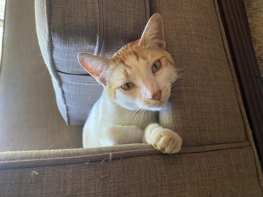 Pet Description:He wears a collar but he recently lost it. He is mainly white but he has some orange patterns in those patterns in has stripes |