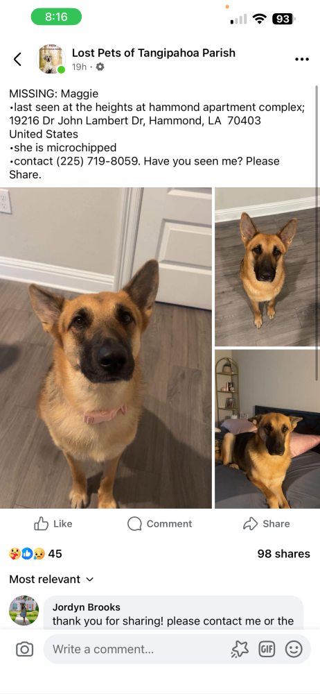 Pet Description:German shepherd, pink collar, scared of men MICROCHIPPED |