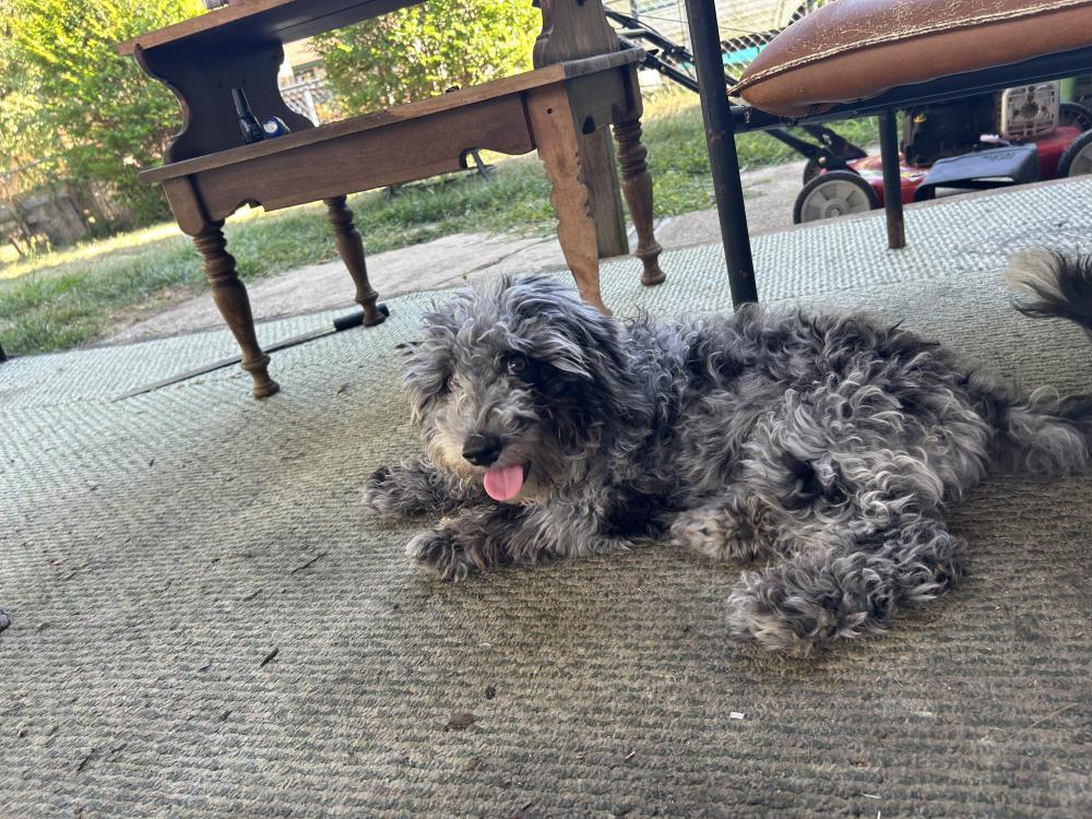 Pet Description:Six month old bordoodle. 13 lbs. teal collar. Black, grey and white spotting. |