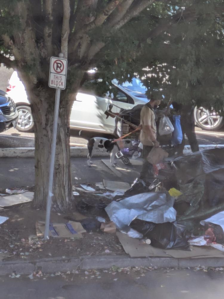 Pet Description:White pitbull with black spots. Showed up at a homeless camp that has been set up for 2 weeks. I'm worried it's stolen as it has not stopped crying and keeps trying to get away. |