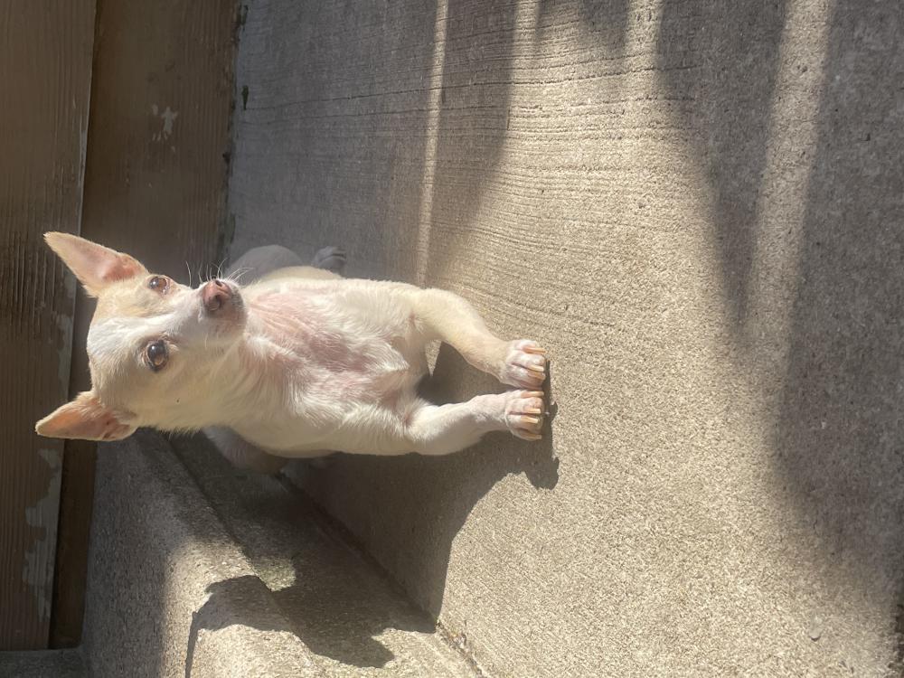 Pet Description:She is wearing a white collar with no tag and has a rash in her paws. Older dog around 17 years old with patchy fur due to skin condition. |