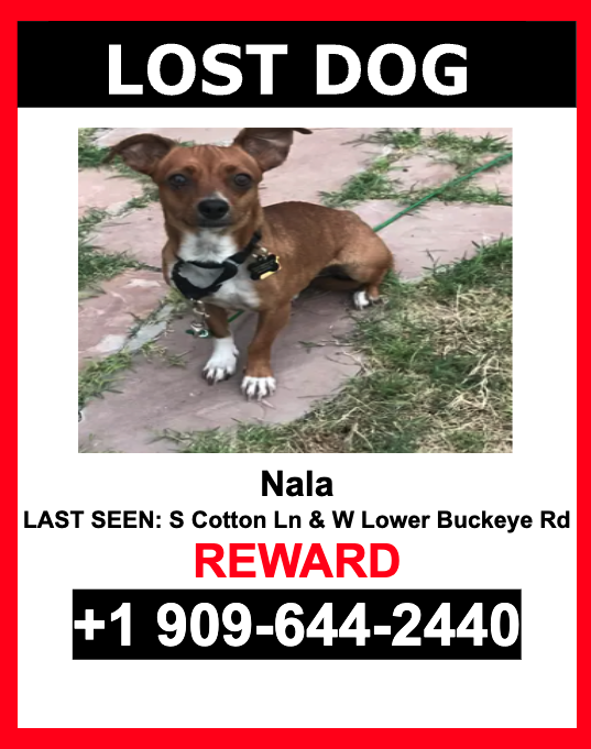 Pet Description:LOST PET - Tan&White - Chihuahua & Dachshund - FEMALE - $$ Reward $$**MISSING SINCE 9/24/25 AT 11:45 AM**Nala is a FEMALE, Tan & White, Chihuahua & Dachshund who escaped and was last seen near S Cotton Ln & W Lower Buckeye Rd. Nala is wearing HER COLLAR without tags. If you see Nala please DO NOT CHASE HER. PLEASE CALL OR TEXT ONLY. +1 909-644-2440 $$ Reward $$ |