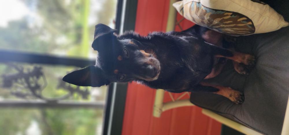 Pet Description:Medium height, o e pointed ear up and one floppy ear. Friendly but barks at trucks and bycicñes. |