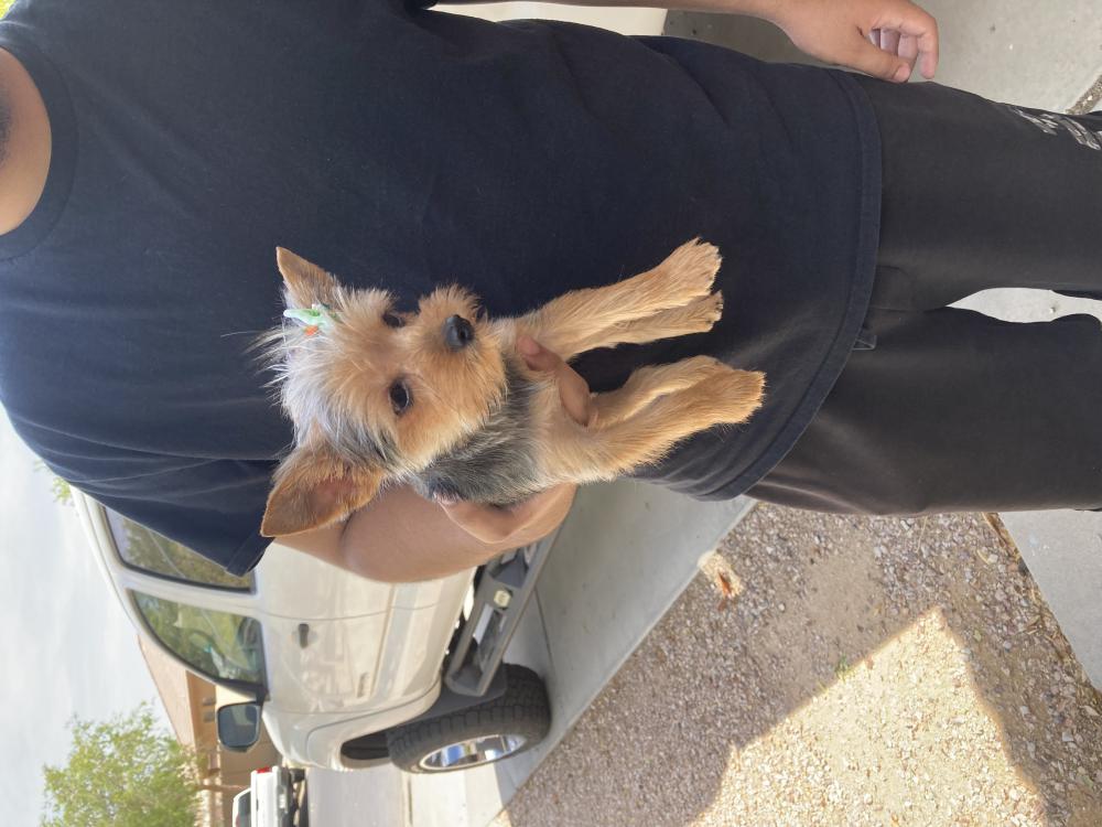 Pet Description:Under 5 pounds, short tail. Majority black with some brown. Has some white on the top of her head. Her body is groomed and her head has longer fur than the rest of her body. |