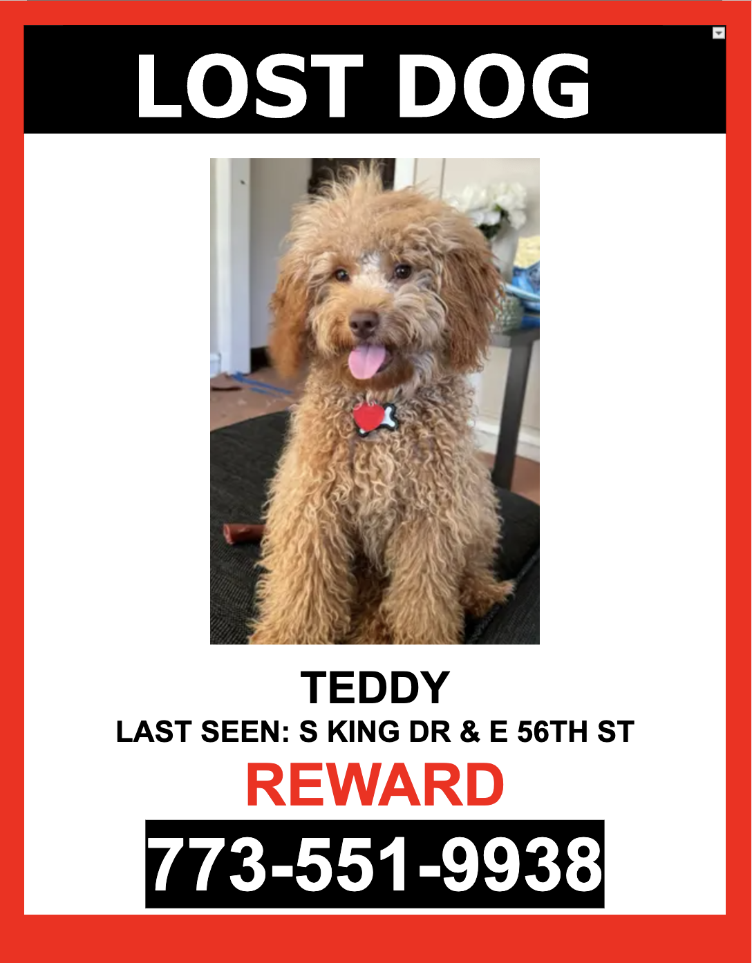 Pet Description:LOST PET - BROWN / COCKAPOO / MALE - $$ Reward $$**MISSING SINCE 09/25/25** TEDDY is a MALE, BROWN, COCKAPOO who escaped and was last seen near S KING DR & E 56TH ST. TEDDY is wearing HIS COLLAR with tags If you see TEDDY please DO NOT CHASE HIM PLEASE CALL OR TEXT ONLY. 773-551-9938$$ Reward $$ |