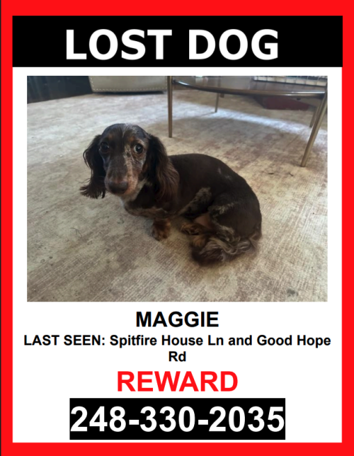 Pet Description:LOST PET - BROWN/WHITE / DACHSHUND / FEMALE - $$ Reward $$**MISSING SINCE 09/25/25** MAGGIE is a FEMALE, BROWN/WHITE, DACHSHUND who escaped and was last seen near Spitfire House Ln and Good Hope Rd. s If you see MAGGIE please DO NOT CHASE HER PLEASE CALL OR TEXT ONLY. 248-330-2035 $$ Reward $$ |