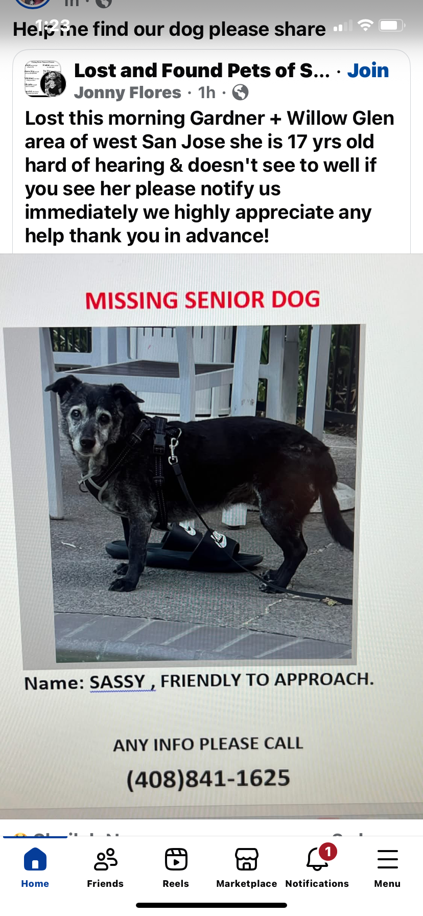 Pet Description:Black / white Senior dog . She is 17 years old loving and friendly to approach..Please help to bring our baby home |
