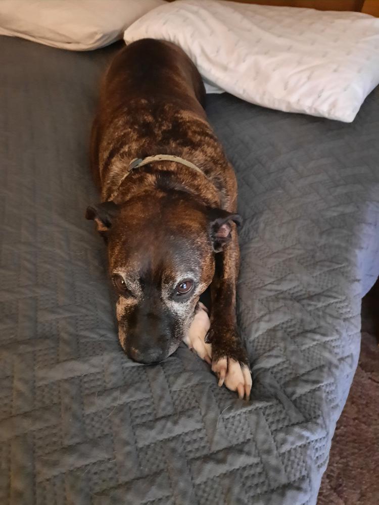 Pet Description:Candy Cane is an 11 year old American Pit she is brindle color with a gray face she takes medicine daily. She is missed dearly |