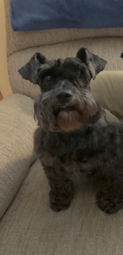 Pet Description:Small black miniature Schnauzer with light grey in his beard. He is a male. His teeth are crooked and broken mostly in his bottom row of teeth. He is a little chunky for his size. And he can be very anxious. |