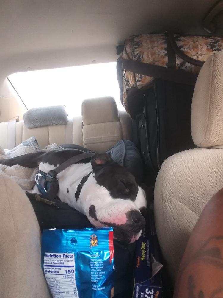 Pet Description:All black with a little bit of white on middle of forehead, middle of chest and on all 4 legs and feet. Its an American Staffordshire pitbull terrier. Has a non cancerous lump on left hind/ backside butt that you cannot miss. Can shake at times due to stress and uncomfortable situations. Very picky and dainty/gentle eater. Is great with adults big and small, but not so much with children and other dogs but absolutely hates cats and will try to kill/eat them. He is also neutered, is deathly afrai |