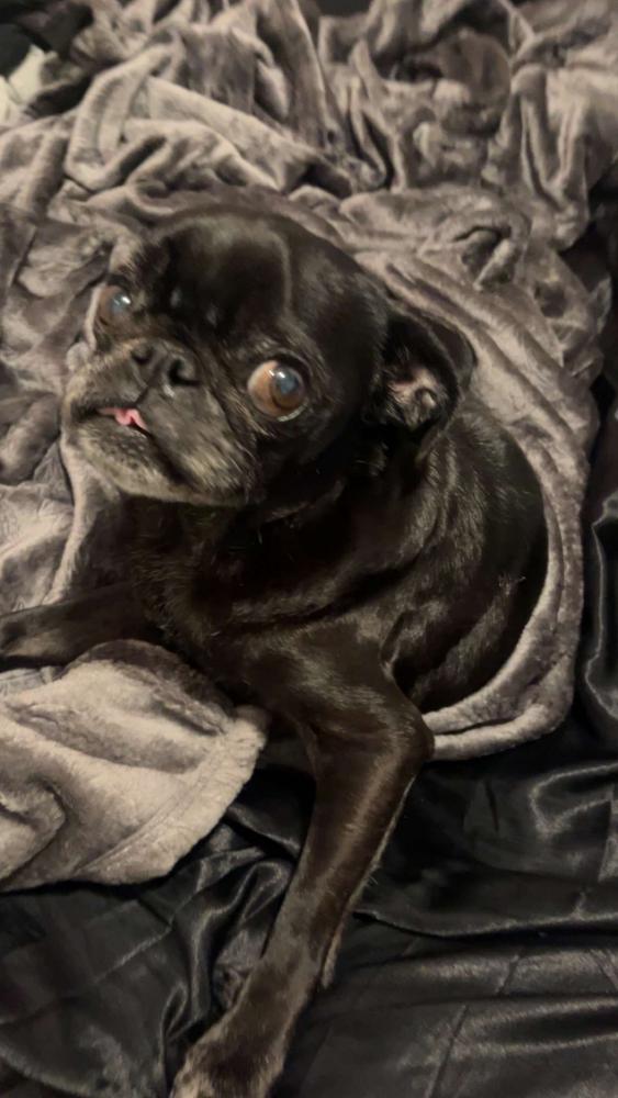 Pet Description:Older, Male, Black, Pug. Grey hair on his chin and he’s neutered |