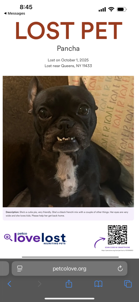 Pet Description:She’s a black frenchi, with a big white spot on her chest. She’s very friendly and responds to the name Pancha. Please help me find my baby |
